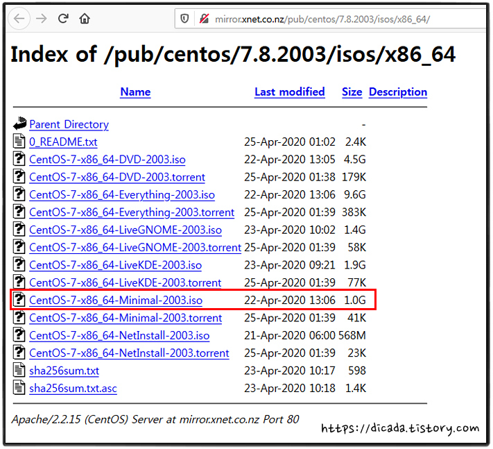 [ CentOS-7-x86_64-Minimal-2003.iso]를 선택하세요.
