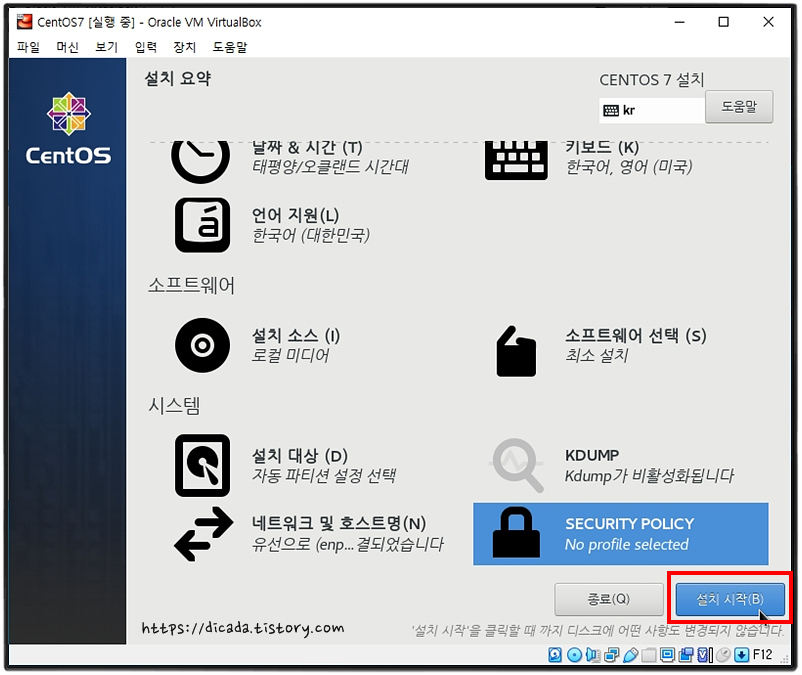 모든 설정 을 확인 + 변경 되었으면, [설치시작]에 클릭하세요.