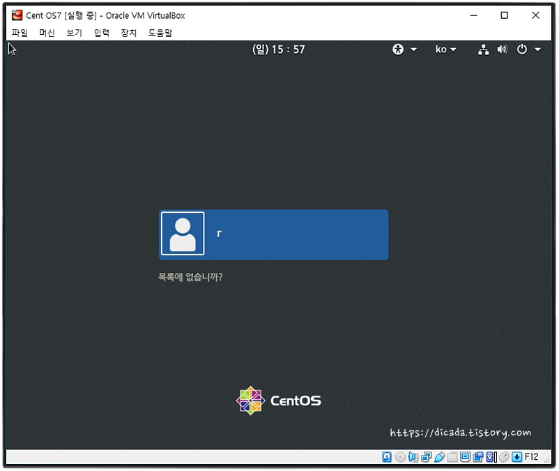 부팅해서 CentOS7이 시작하면, 사용자 이름과 암호를 입력하는 화면이 나타납니다.