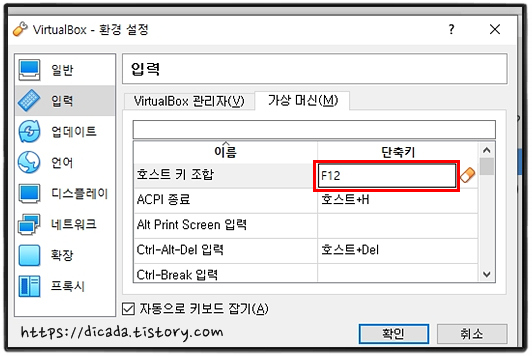 부팅되는 동안, VirtualBox의 메뉴에서 [입력]을 선택