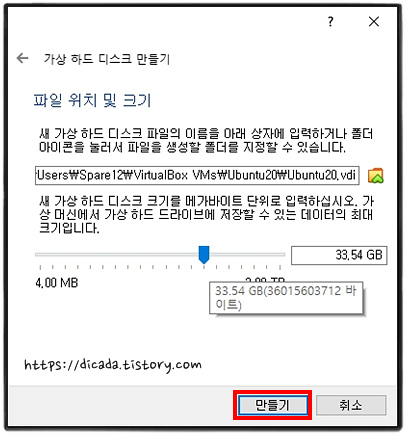 하드디스크 크기는 본인이 원하는 만큼 정하지만, 최소 요구사양의 25Gb 이상은 만들어 주어야 합니다.