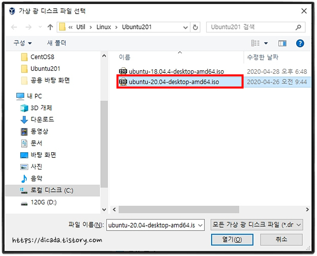 다운로드한 Ubuntu-20.04-desktop-amd64.ISO 파일을 연결시키는 과정입니다.