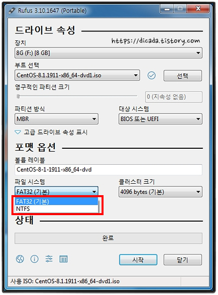 FAT32(기본)을 선택 했습니다.