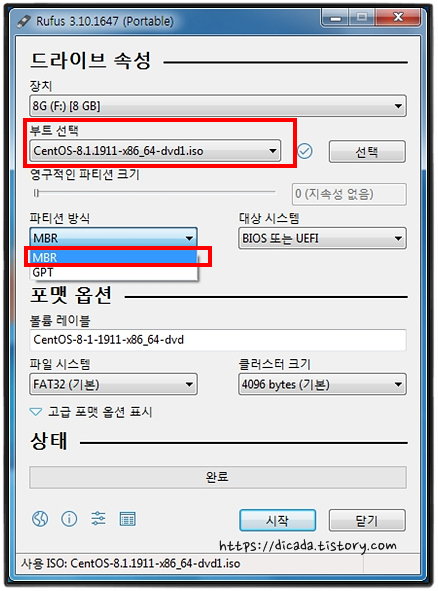 컴퓨터 CMOS의 설정에 따라서 [GPT]방식을 지원하지 않을수도 있으므로, [MBR]을 선택 합니다.