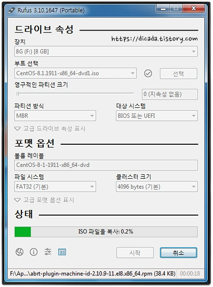 [선택]을 클릭해서 다운로드 받은 CentOS-8의 ISO 파일을 열어주면, 아래와 같이 됩니다.