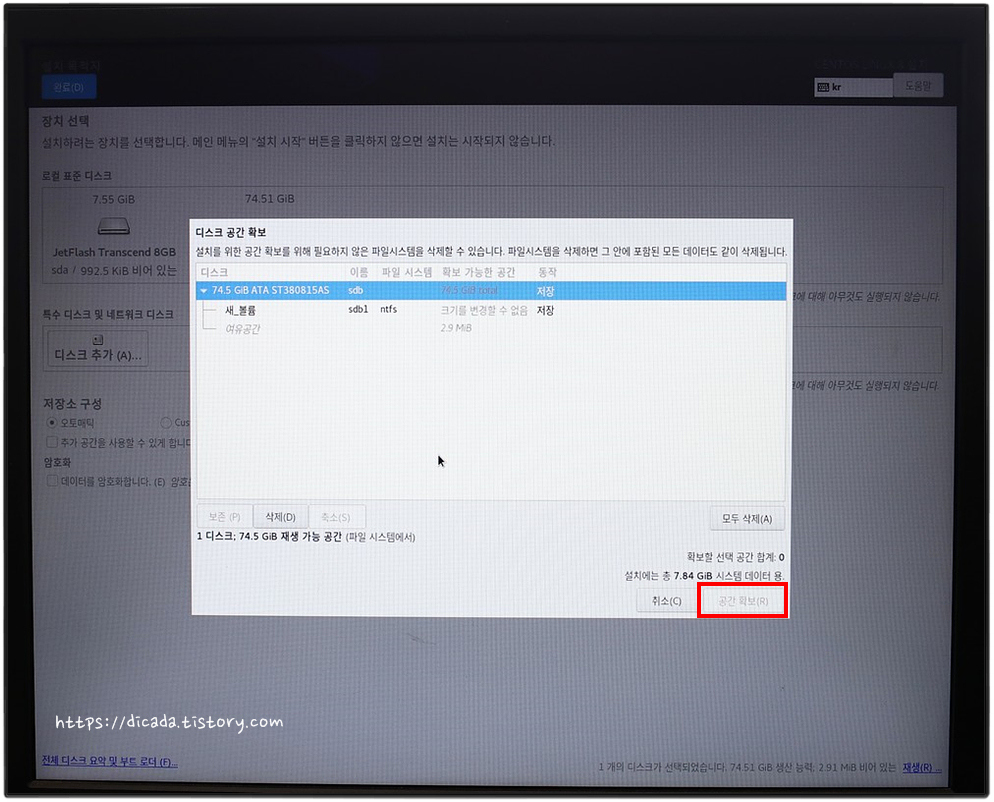 [설치목적지]는 당연히 비어있는 하드디스크 드라이브를 선택