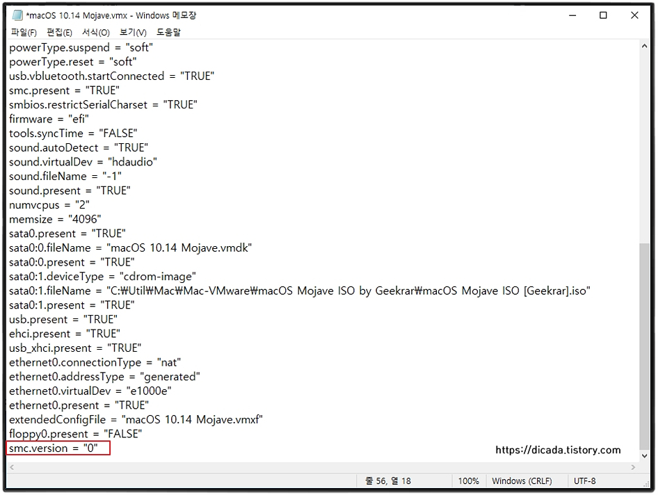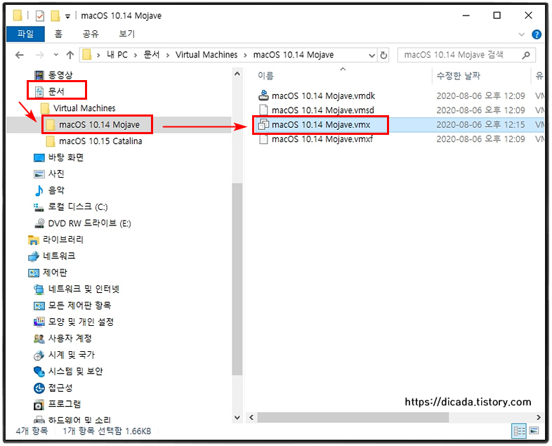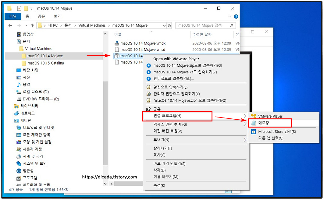 그 폴더 안에 있는 [macOS 10.14 Mojave.vmx]를 선택, 오른쪽 마우스를 클릭하세요.