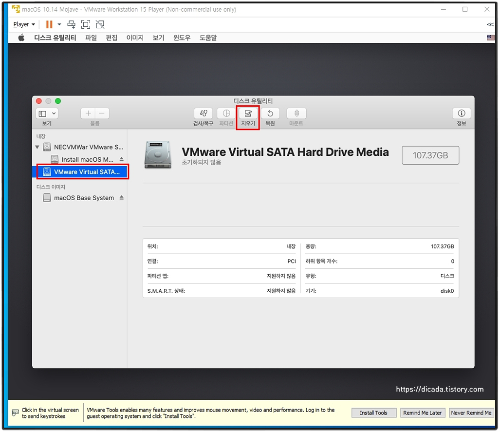 [VMware Virtual SATA Hard Drive Media]를 선택하시고 [지우기]를 선택합니다.