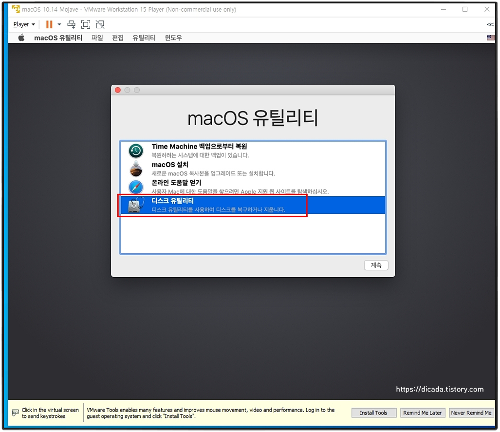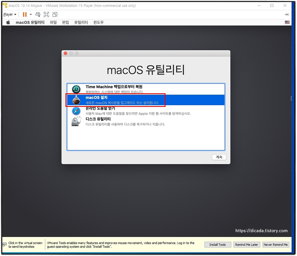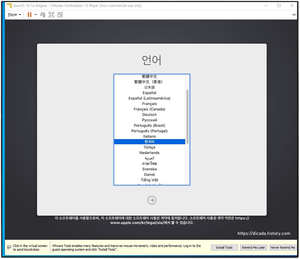 [Play virtual machine]를 클릭하시면, macOS-Mojave의 ISO파일이 연결 되어있기에, 인스톨 과정이 진행합니다.