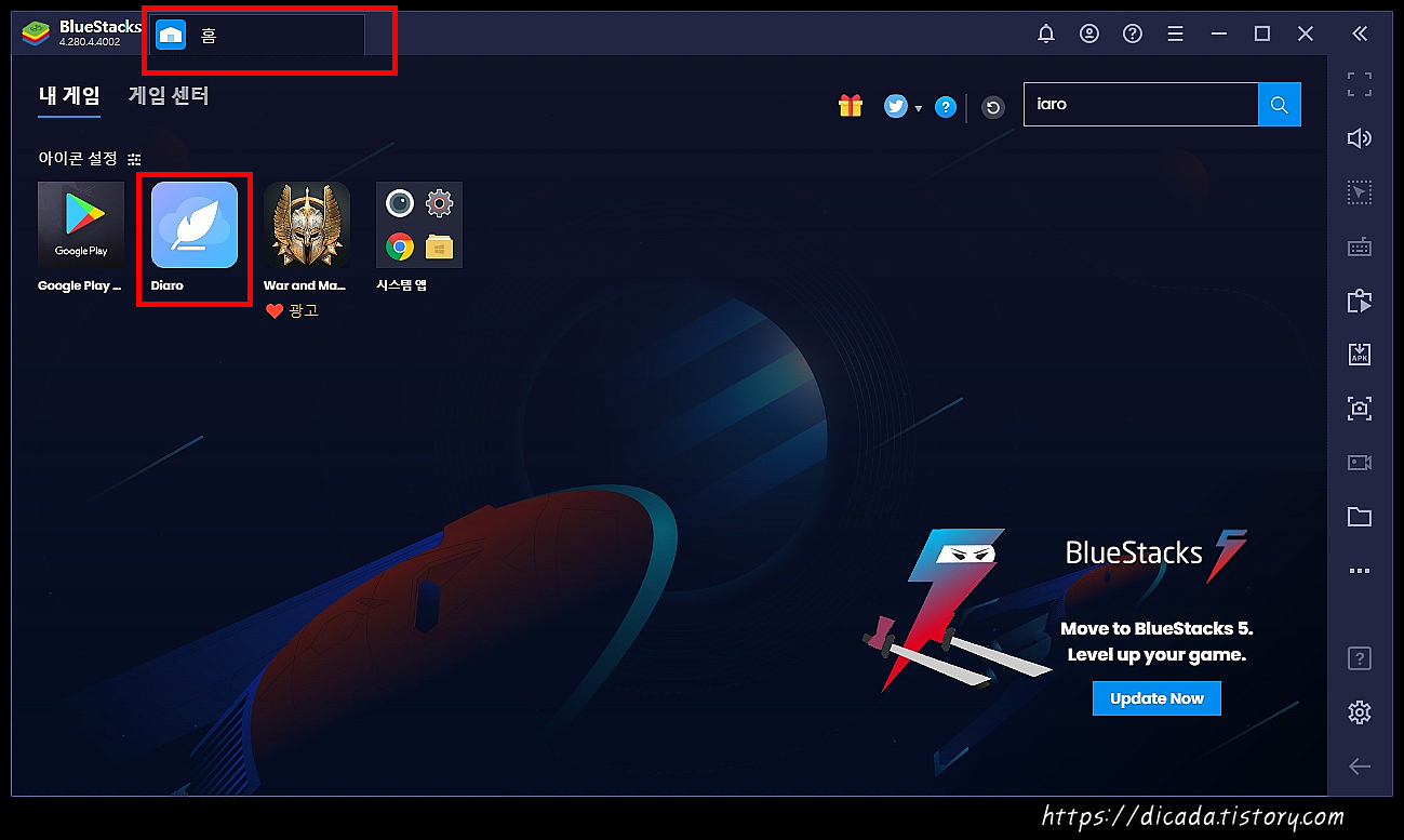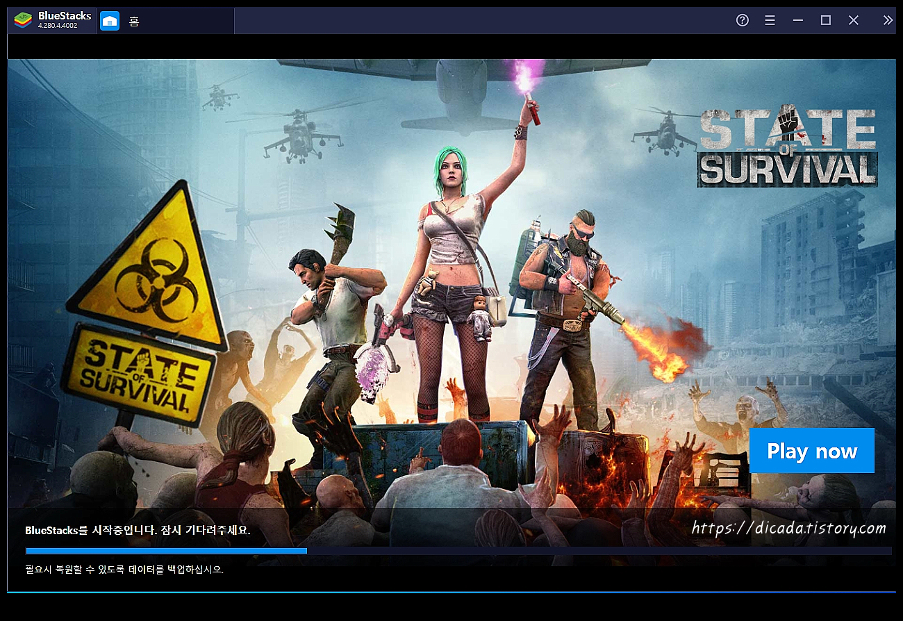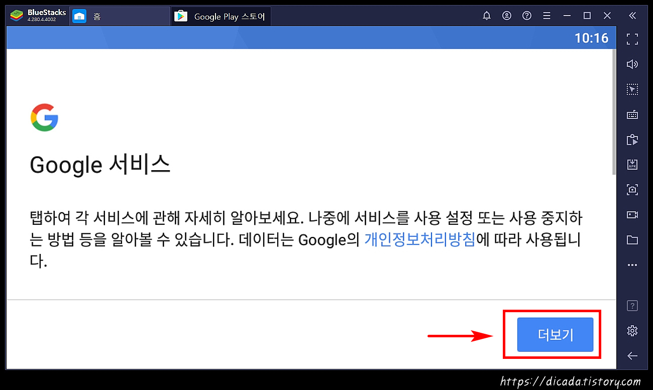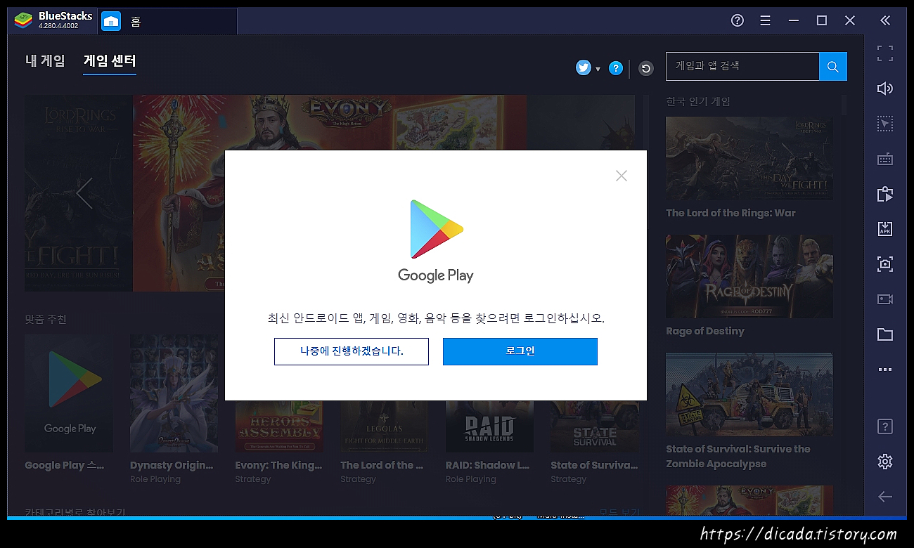 처음 프로그램 설치 후에는 자동으로 BlueStacks가 구동이 되구요,