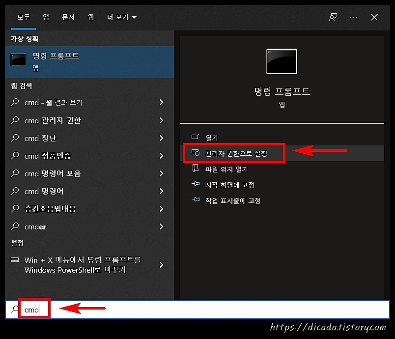 [ 찾기 ]에서 [ CMD ] --> [ 관리자 권한으로 실행 ] 을 선택합니다.