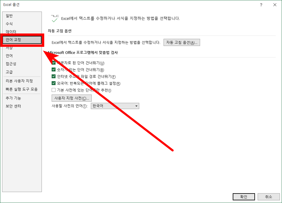2. 옵션 창이 나타나면 [언어교정] ---> [자동 고침 옵션(A)..] 에 클릭
